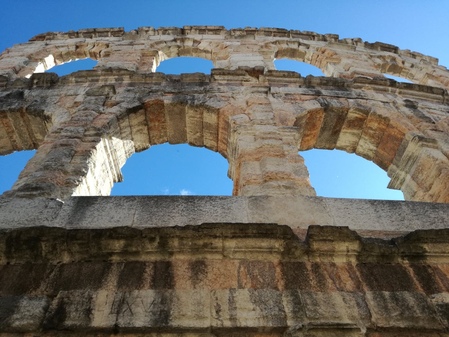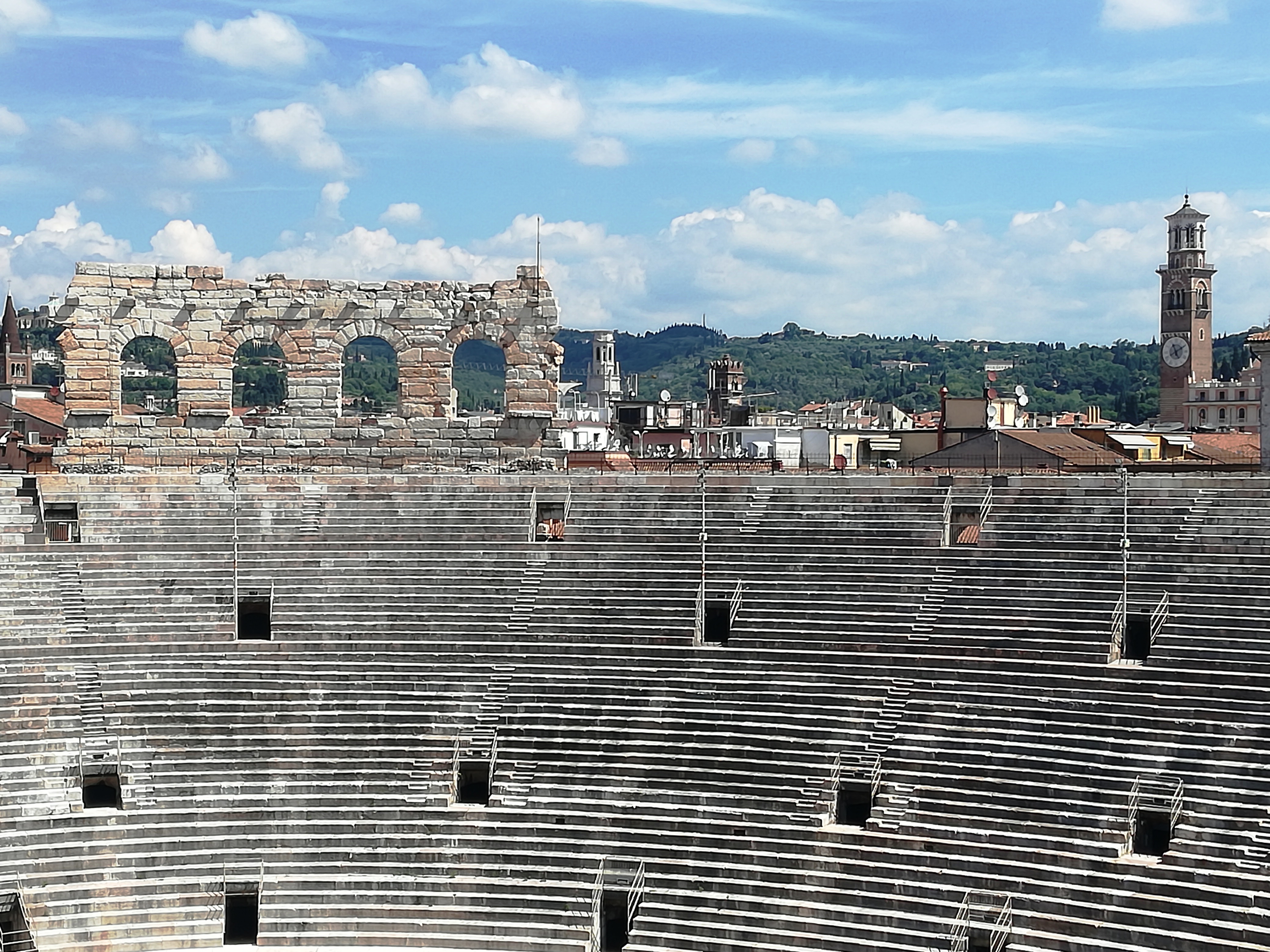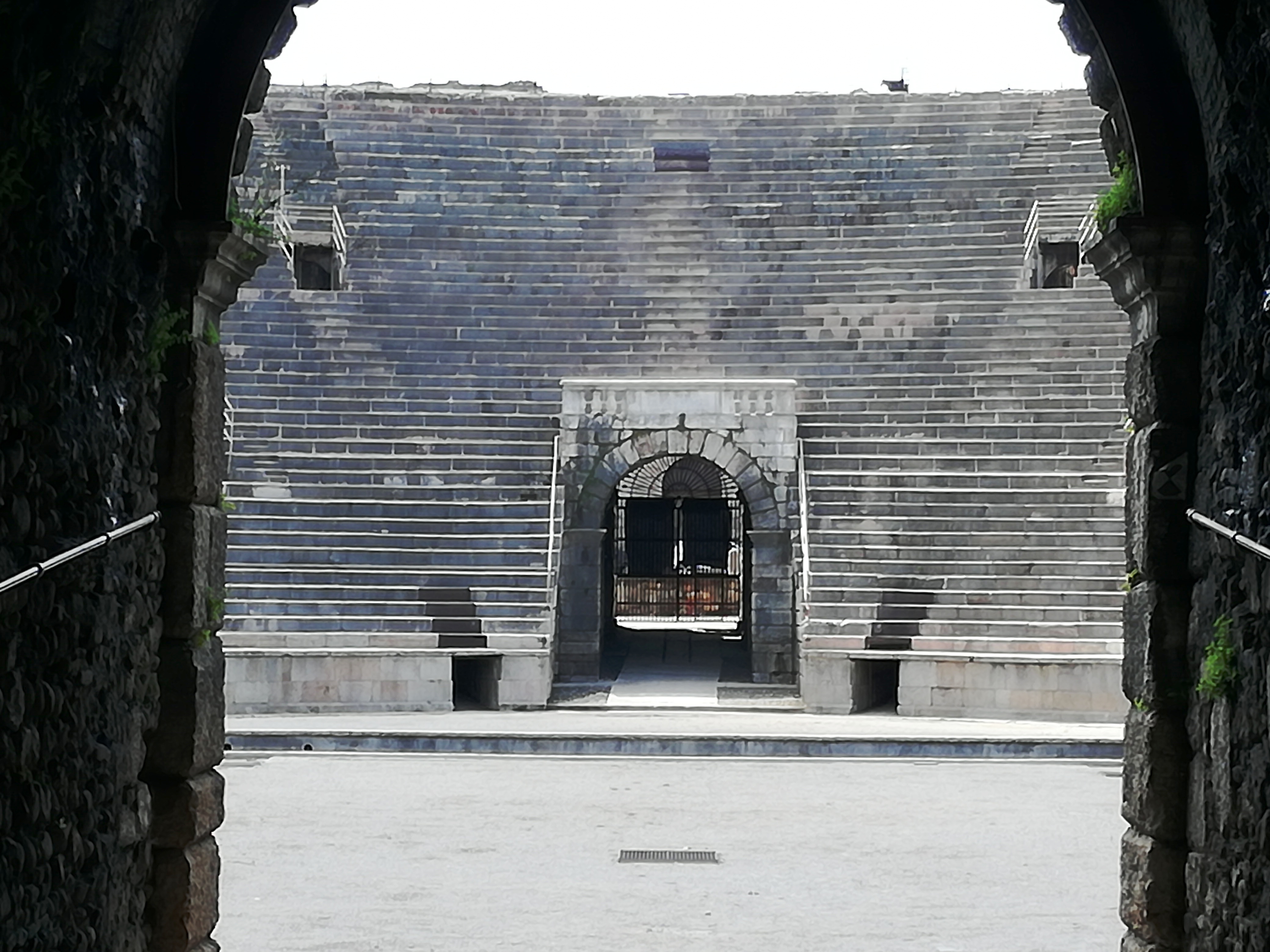 L’anfiteatro si erge in piazza Bra, la stessa piazza presso la quale ci ritroveremo per iniziare il tour. Prima di accedere all’interno dell’anfiteatro sosteremo più volte esternamente per esaminare tracce interessantissime della storia del monumento. Tanto sorprendente sarà indugiare fuori dall’anfiteatro quanto affascinante sarà percorrere i suoi arcovoli, accedere all’arena propriamente detta utilizzando la porta triumphalis come un tempo i gladiatori e sedersi sulle gradinate come ancora oggi si usa fare durante gli spettacoli, non solo operistici, ma lo faremo come lo avrebbero fatto gli spettatori dell’epoca in base alla classe sociale di appartenenza. Varcheremo, quindi, più volte la soglia dei vomitoria per scoprire dettagli incredibilmente ancora presenti come canalette di scolo, rampe d’accesso ai piani, gradini, parapetti, sempre alla ricerca dei segni lasciati dal cantiere romano. Rievocheremo quei giorni per vivere l’anfiteatro come persone di quell’epoca. Raggiungeremo parti della cavea da cui si gode una vista sulla stessa e sulla città semplicemente superlativa. Termineremo la visita in un luogo unico, posto sempre all’interno dell’anfiteatro, difficile da raggiungere e panoramico. Lì ci saluteremo, affinché tu possa rimanere più a lungo, se così ti piacerà, in un luogo così fuori dall’ordinario.