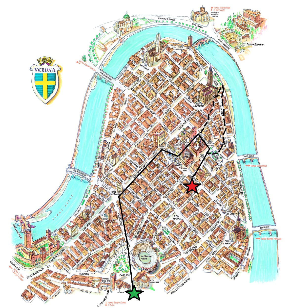 Man besichtigt die Hauptplätze (Bra, Erbe, dei Signori) mit ihren Denkmälern (Arena, Palazzo della Ragione, Palazzo della Scala, Palazzo del Capitano, Loggia del Consiglio, Arche Scaligere); die Hauptstraßen (über Mazzini, über Cappello, den Corso); Man wird das imposanteste römische Tor entdecken und beim Hof der “Casa di Giulietta” im Herzen des historischen Zentrums enden.