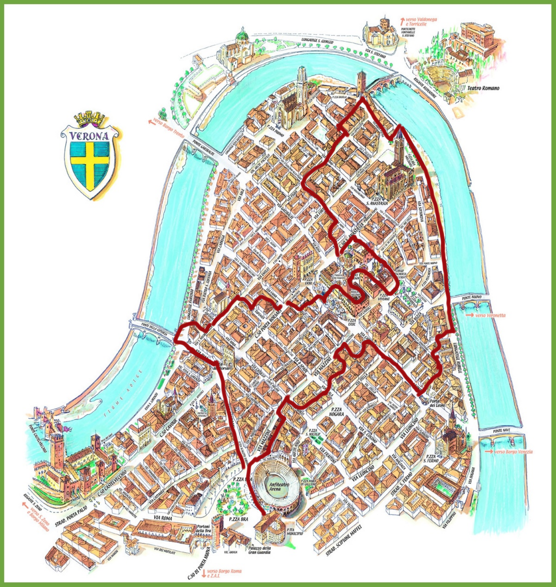 L’itinerario inizia da Piazza Bra con i suoi monumenti, tra cui l’Arena. Dopo aver osservato con occhi attenti l’anfiteatro, anziché incamminarci lungo Via Mazzini, attuale via principale del centro storico, come fanno i più, ci dirigiamo invece verso la strada più antica fra quelle ancora esistenti, vero asse di sviluppo della città: il Corso. Prima di percorrerne un tratto, raggiungiamo un luogo a suo modo nascosto che offre una vista suggestiva su Castelvecchio e il suo Ponte Scaligero sull’Adige. Identificheremo, poi, le mura altomedievali che hanno protetto l’abitato nei “secoli bui” e ci estasieremo con la vista dei resti della porta urbica principale dell’età romana, Porta Borsari, attraverso la quale accederemo al nucleo urbano di età antica. Tra magnifici palazzi distribuiti lungo i cardi e i decumani tra cui si nascondono curiose gemme della cultura locale (lì sono nati il Pandoro ed Emilio Salgari), scopriremo la natura medievale di tanti edifici e come questi siano stati tutti ristrutturati in età moderna. Attraverso angoli nascosti si giungerà quindi a Piazza Erbe, vero fulcro del centro storico sotto molteplici aspetti, dotata non solo dei banchi del mercato, ormai turistico, ma anche delle facciate rinascimentali e barocche più stupefacenti in città, delle rappresentazioni delle città di Verona e Venezia, della fontana più antica in città e delle vecchie misure ufficiali veronesi. Dopo aver scoperto la probabile etimologia del nome della piazza, raggiungeremo il retro delle Case Mazzanti per ammirare un puteale rinascimentale e ritornare sul Corso, grazie al quale poter proseguire verso la parte più settentrionale del centro storico, dove, nuovamente lungo l’Adige, sarà possibile ammirare il Colle di San Pietro e, tra le altre cose, le rovine del Teatro Romano e le mura tardomedievali, che ci introdurranno al periodo storico di maggior gloria per Verona. Infatti ci attendono piazze come Piazza dei Signori e edifici come il Palazzo della Ragione con la Torre dei Lamberti, il Palazzo con Torre del Capitano, il Palazzo del Podestà già Palazzo Della Scala, e capolavori della scultura trecentesca veronese (Arche Scaligere) che ci faranno parlare dell’evoluzione politica nelle nostre città al tempo dei “secoli d’oro.” Sarà proprio questo argomento che ci permetterà di affrontare e chiarire uno dei temi più cruciali per Verona: quello di Romeo e Giulietta. Ma siete davvero sicuri che queste due figure siano semplicemente frutto del genio del Bardo che mai, però, ha avuto modo di metter piede sul suolo italico? Questo ed altri temi verranno affrontati e le tue domande troveranno tutte le risposte del caso. Ma il tour non finirà lì. Lasciati stupire..